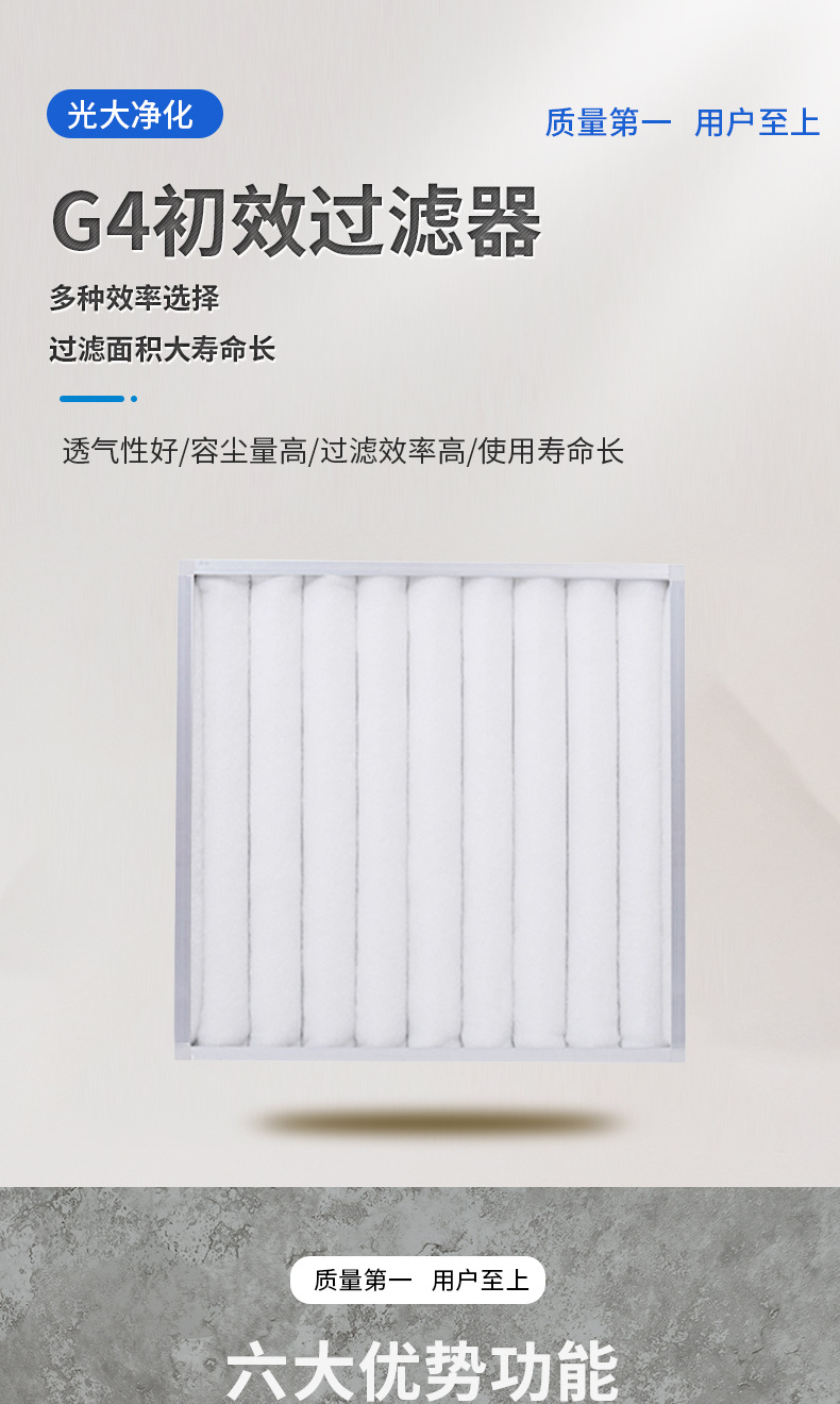初效过滤器常使用在空气质量要求不高的通风空调系统,或周围环境较恶劣、粉尘、油脂较大的场所作为初级预过滤,G4初效板式空气过滤器用材一般使用铝框、镀锌铁框作为外框材质,牢固可靠。可以更换里面的滤棉重新使用。